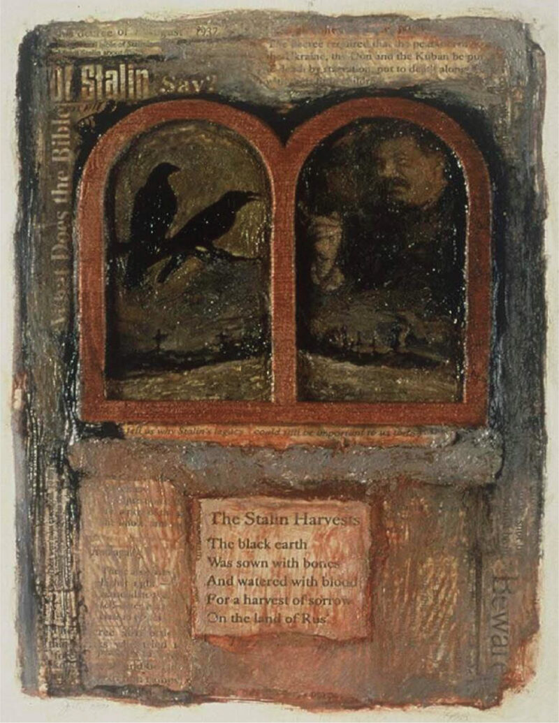We then delved into Lydia’s first visit to Ukraine in the 1990s, which she described as a pivotal moment in her life and work. Despite feeling her "Americanness" due to being born in a free country, she felt a deep connection to her Ukrainian roots. This trip sparked her interest in creating art that tells the story of Ukraine, especially lesser-known events like the Holodomor, a topic many in Ukraine were unaware of at the time. Lydia expressed how this experience led her to pursue artwork that bears witness to meaningful past and current events, creating a dialogue between the viewer and the historical narratives she explores.